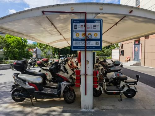 走进南川园新村11号楼东侧,全区首批室外电动自行车充电桩配套喷淋系统已投入使用,簇新的车棚内有不少电动自行车正在充电。
