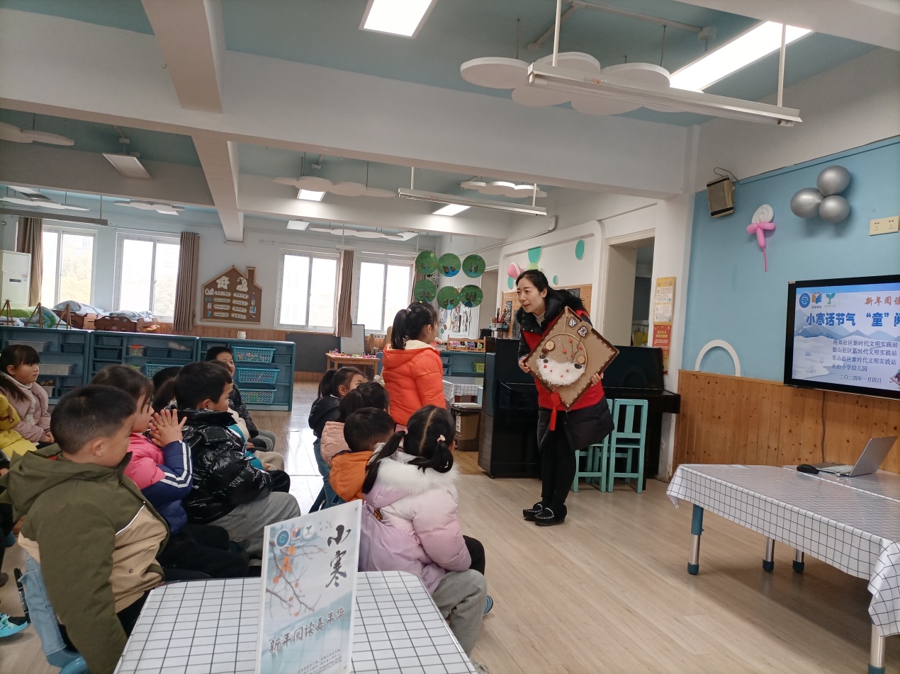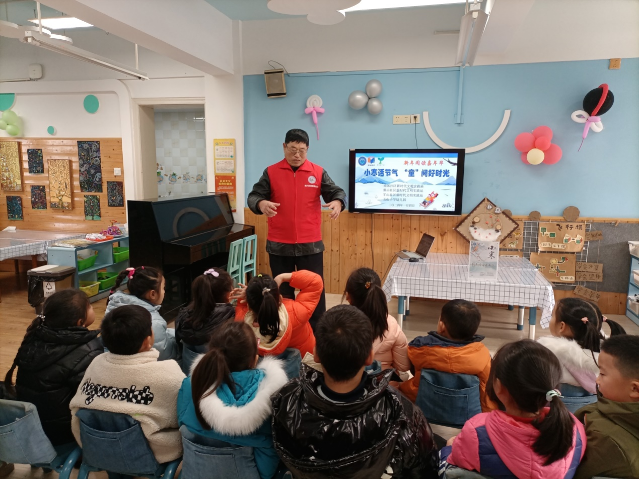 小寒至,严冬始,踏雪寻梅正当时。1月4日,崇川区狼山镇街道新时代文明实践所携手南郊、狼山、军山社区,走进五山小学幼儿园,共同开展“缤纷冬日——‘小寒’话节气,童‘阅’好时光”主题活动,社区志愿者来到孩子身边,与孩子们一起品读“小寒”民俗文化,共享美好时光。